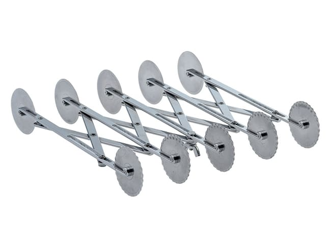 Rouleau en inox équipé de 5 lames lisses et 5 lames cannelées, très utile pour la découpe des pâtes en plusieurs bandes régulières. Largeur de découpe réglable.