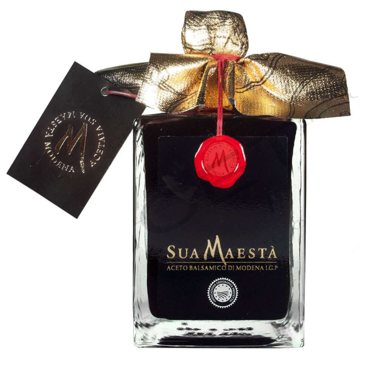 Le Vinaigre Balsamique de Modène IGP “Sa Majesté” est de couleur marron intense, brillante, au goût aigre-doux équilibré et optimal et allie “élégance, charme, originalité et délicatesse”.Â
