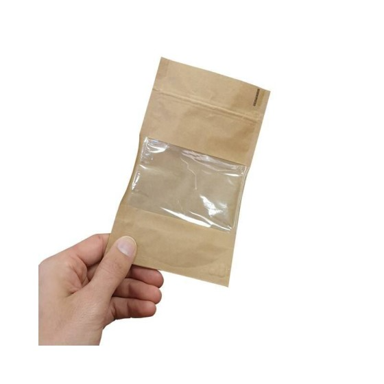 Sachet Doypack kraft brun avec zip et fenĂȘtre 11 + 6,5 x 18,5 cm – par 100