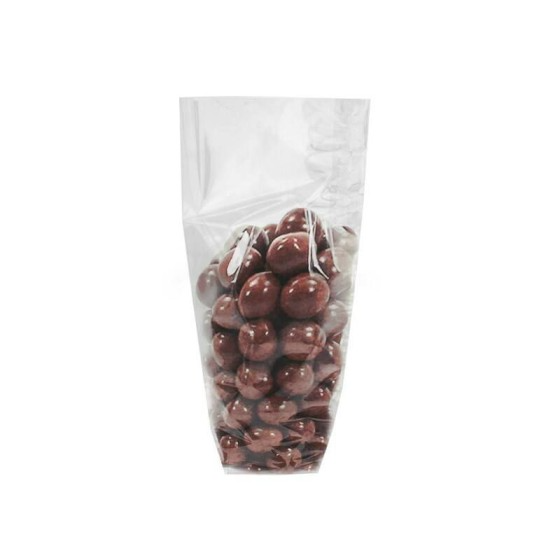 Ce sachet écorné transparent avec fond cartonné est recommandé pour les chocolatiers et confiseurs qui peuvent mettre en valeur leurs chocolats, dragées et bonbons avec un emballage plastique élégant et résistant.?