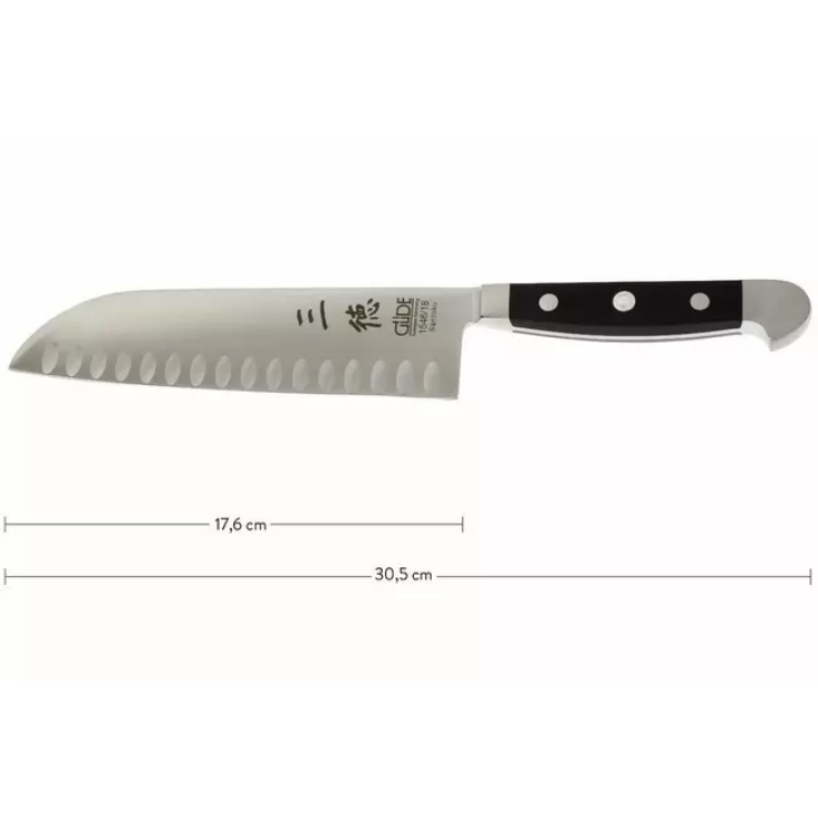 Santoku de la série Alpha de Güde. Ce santoku a un bord granton qui est destiné à empêcher les aliments de coller au couteau. Vous trouverez plus d’informations à ce sujet ici sur notre page d’informations sur les bords granton.