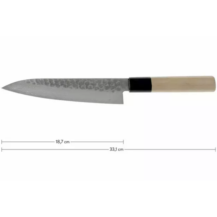 Le couteau santoku de la collection Damas 45 couches de Sakai Takayuki. Ce couteau de chef, également appelé gyuto, est le plus petit des trois couteaux de chef de la collection.