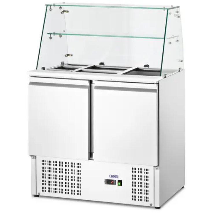 L’un des principaux avantages de cette saladette professionnelle, c’est son volume impressionnant de 240 l. Vient s’y ajouter une vitrine d’une longueur de 90 cm, capable d’accueillir un bac GN 1/1, trois bacs GN 1/3 ainsi que trois bacs GN 1/6, qu’on peut utiliser pour stocker simultanément une grande variété d’aliments. L’élégante vitrine en verre protège les denrées contre les contaminants tout en les présentant de manière alléchante. Sous la vitrine, un meuble équipé de deux portes et de deux tablettes supportant chacune jusqu’à 30 kg accroit l’espace de rangement disponible. Sur le meuble, une planche à découper intégrée favorise un travail efficace.