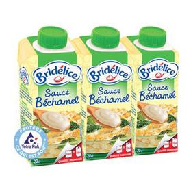 Sauce béchamel stérilisée UHT longue conservation Ingrédients : LAIT entier, crème (LAIT), amidon modifié, sel, stabilisants: gomme de xanthane, carraghénanes, arômes naturels, poivres, colorant E150c.