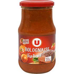 Purée et pulpe de tomates (France) 71,1%, viande bovine cuite (France) 14% (soit 20% équivalent viande crue), oignons 5%, carottes 4%, huile de tournesol, sucre, sel, amidon transformé de maïs, vin blanc, épices et plantes aromatiques (dont ail 0,06% et CELERI-feuille), acidifiant : acide lactique.Certains ingrédients de ce produit ne proviennent pas de France.Traces éventuelles de céréales contenant du gluten, lait, moutarde et graines de sésame