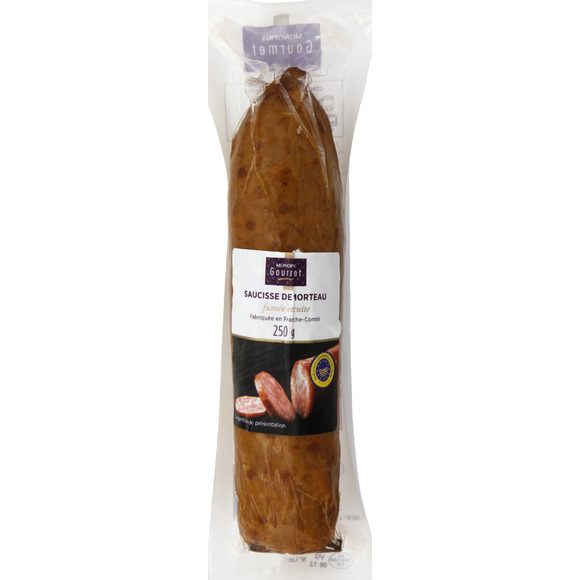 DLC minimum garantie: 10 jours- Monoprix Gourmet a sélectionné pour vous cet incontournable de la gastronomie française : fabriquée dans le Doubs (25), cette saucisse est exclusivement à base de viande de porc 100% origine France. Le fumage se fait encore “tuyé”, ces grandes cheminées typiques des fermes Francs-Comtoises qui servaient autrefois de réserve à viande. Dégustez là chaude accompagnée de salade ou de pommes de terre.