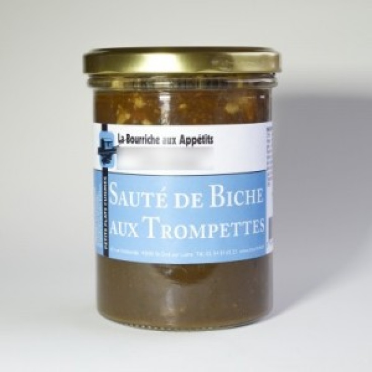 INGREDIENTS: CERF sauvage (35%)(France), sauce (eau, vin rouge(sulfites), oignon, sang de porc (france), amidon de maïs, farine de blé;, concentré de tomate, cognac (sulfites), sel, huile de tournesol, ail, bouillon de volaille, caramel liquide, sucre, persil, poivre blanc), Trompettes des Maures (3%).