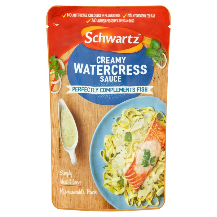 Create the perfect Creamy Watercress Sauce with this expertly blended Schwartz recipe mix, including onion, white pepper, parsley and watercress, for a delicious flavor you’ll want to try again and again. Perfectly complements fish, Simply heat & serve, Microwaveable pack, Ready in 5 minutes, No hydrogenated fat, No added preservatives or MSG, No artificial colors or flavorings, Suitable for vegetarians.