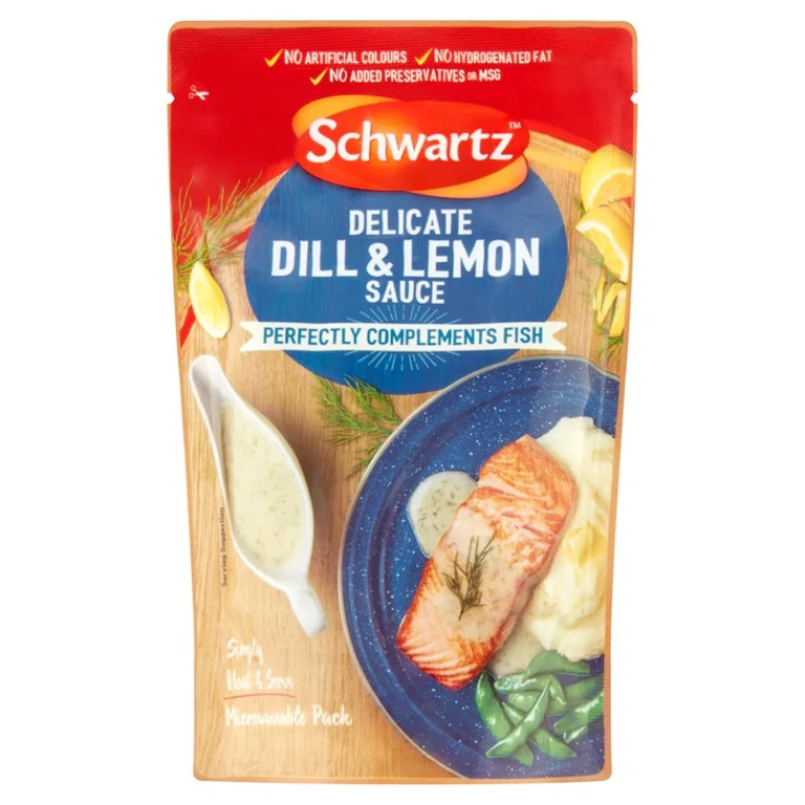 Achieve the perfectly seasoned fish with Schwartz Dill & Lemon Sauce, featuring a premium blend of lemon, dill and parsley for a delicious flavor you’ll want to try again and again. Perfect with pan-fried cod or salmon, mashed potatoes and green beans or with fish pasta dishes. Perfect for fish, Ready in 5 Mins, Simply Heat & Serve, Microwaveable Pack, Full of Flavor, No Added Preservatives or MSG, No Artificial Colors or Hydrogenated Fat.