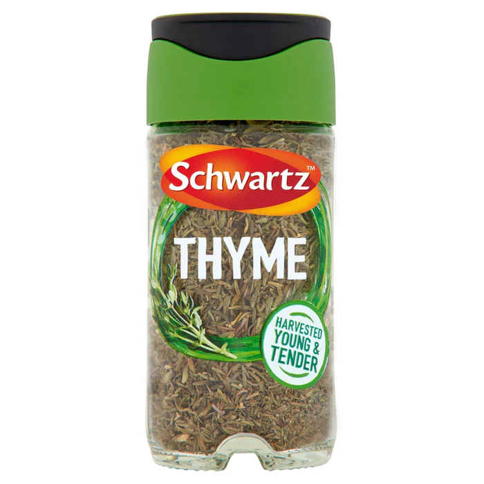 Schwartz Thyme is harvested young and tender for a fragrant aroma and lively flavor. Schwartz work directly with local farmers across over 40 countries to ensure our ingredients are of the highest quality. Carefully selecting the best spots to grow our herbs and spices around the world allows us to guarantee intense flavors, vibrant colors and powerful aromas. Perfect for seasoning roasted vegetable, meat and fish dishes, as well as for bringing out the flavor of marinades, stocks and soups. Picked with care, Packed with flavor, Schwartz Thyme is harvested young and tender for a fragrant aroma and lively flavor, This warm, minty and aromatic herb is a key ingredient in French and Middle Eastern cooking.
