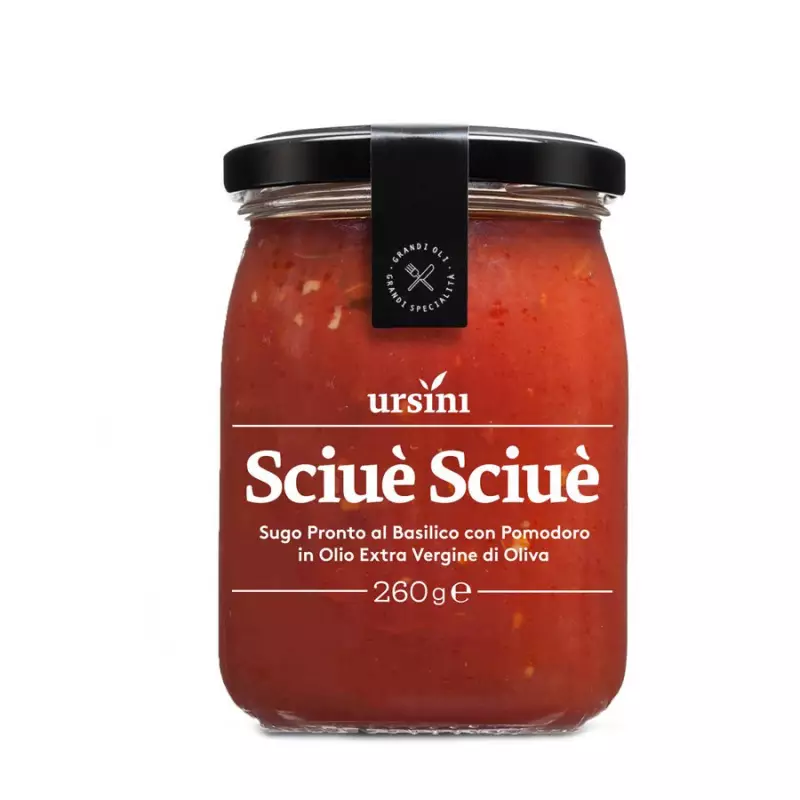 Ursini’s Sugo Sciuè Sciuè is a simple and genuine recipe based on tomato and basil in extra virgin olive oil. With this sauce reminiscent of Sicilian and Campanian flavours, Ursini re-proposes the best of traditional Italian cuisine with all the richness that only simplicity can offer. With this ready-made sauce you can bring all the authentic and genuine flavour of Southern Italy to the table in just a few minutes. Try it to prepare the famous spaghettini Sciuè Sciuè.