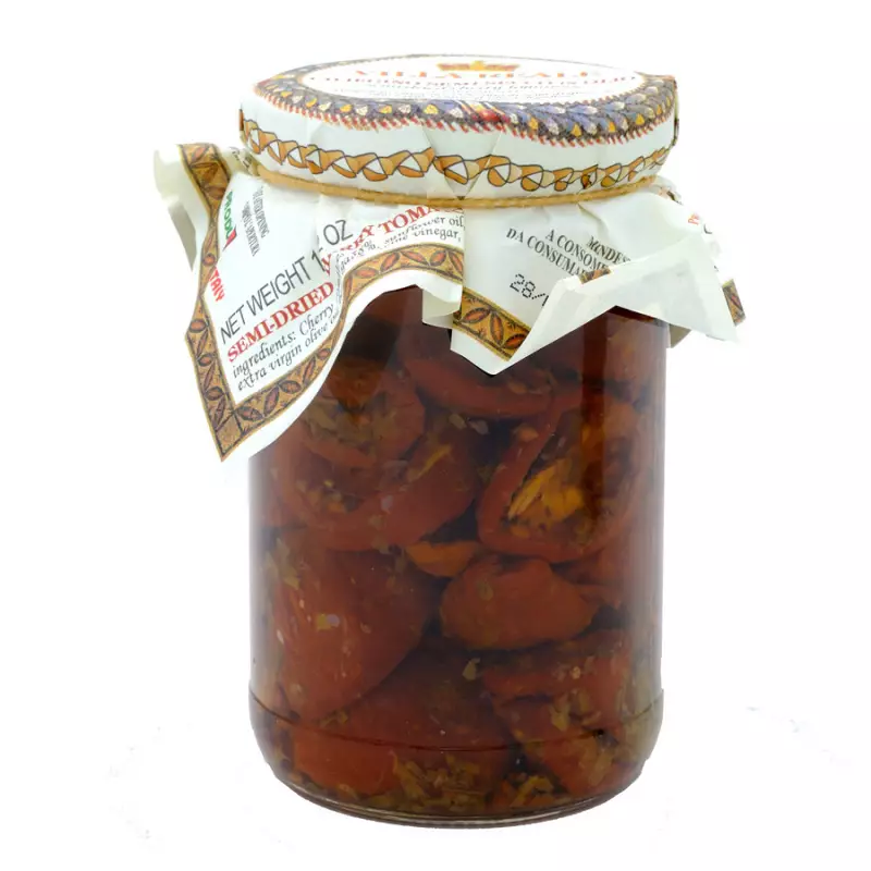 The Villa Reale Semi-dried Seasoned Cherry Tomato is subjected to a drying process that takes less time than the classic dried tomato. This ensures that the product retains all its softness and its authentic taste. Villa Reale cherry tomatoes are prepared with extra virgin olive oil and basil. Ideal as an appetizer, to enrich salads or simply on a slice of toasted bread.