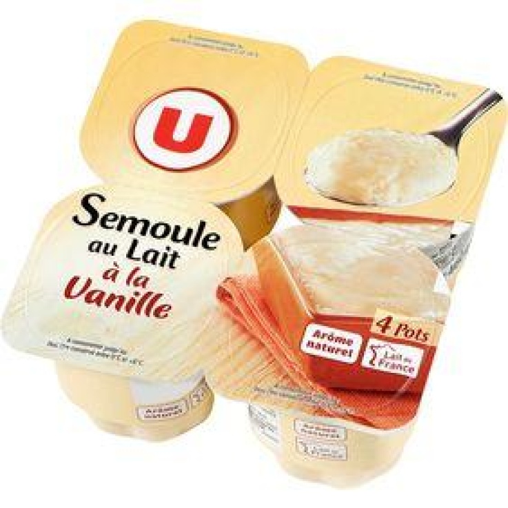 Semoule au lait à la vanille LAIT entier 83%, sucre, semoule de BLE 6%, amidon de riz, arôme naturelle de vanille, concentré de carotte.