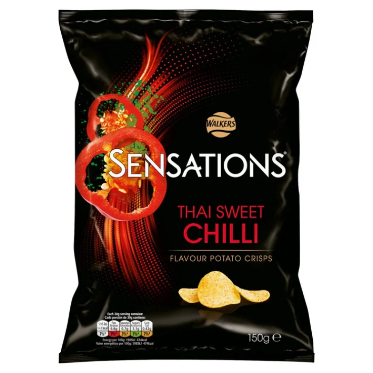 Discover the extraordinary flavor of Sensations crisps, made with specially selected potatoes and thicker cut for a satisfying crunch. Sensations Thai Sweet Chili Crisps combine a subtly sweet and spicy flavor with fragrant herbs and a delicate kick to finish. Specially Selected Potato Varieties, Thicker Cut for a Satisfying Crunch, No Artificial Colors or Preservatives, No added MSG, Suitable for vegetarians.