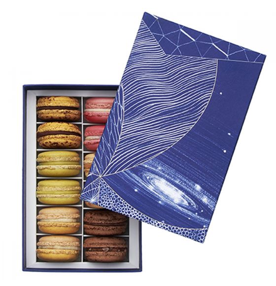 Coffret de 12 macarons composé des saveurs suivantes :
