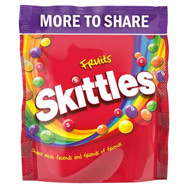 A sharing size bag of Skittles Fruits sweets 350 grams, Skittles chewy bite-sized sweets are a bright, colourful explosion of fruity flavours, Skittles Fruits sweets include Lemon, Blackcurrant, Strawberry, Lime and Orange flavours