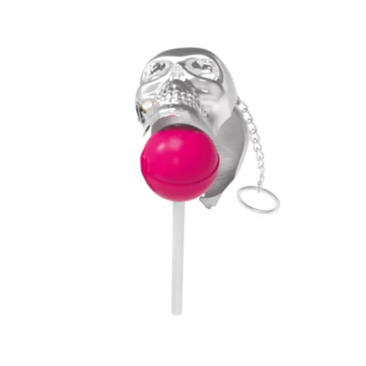 WOM – Sucette goût fraise porte-clés métallisé en forme de crâne vendu dans un présentoir de 12 sucettes