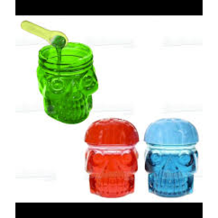 BRABO – Contenant en forme de crâne avec un bouchon en forme de cerveau renferme un bonbon gel + cuillère en dextrose – Vendu en gros conditionnement dans un présentoir de 12 pcs