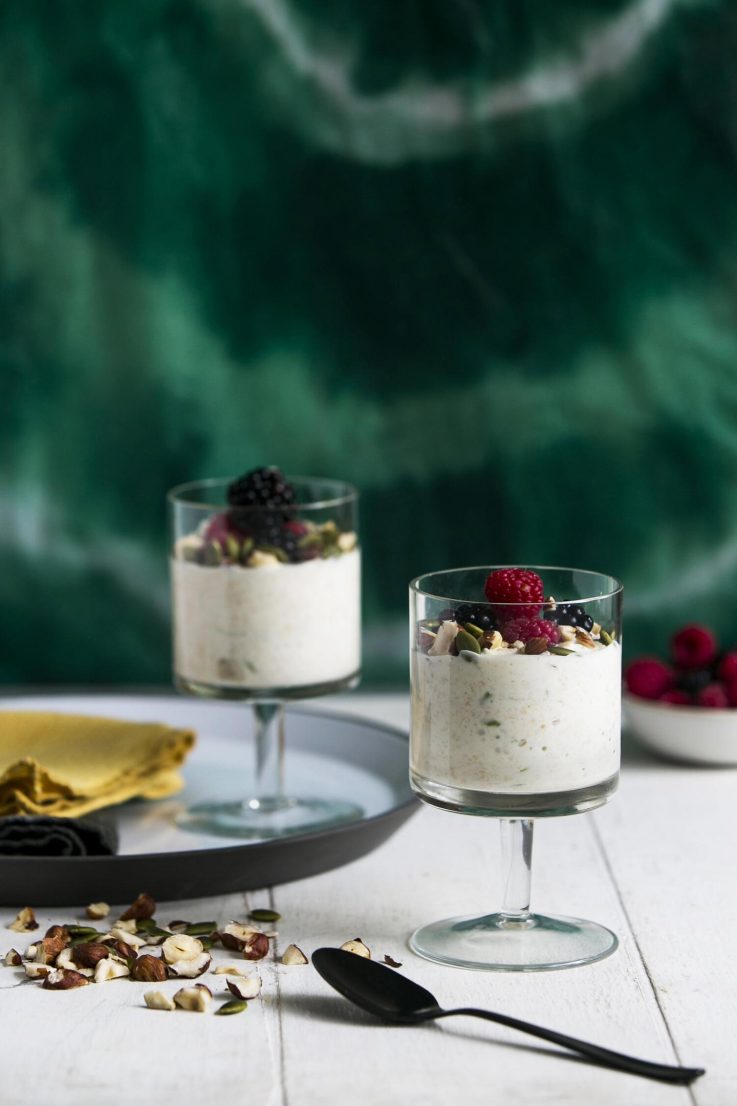 To serve, spoon the bircher into bowls or glasses and top with hazelnuts, pepitas and fresh berries.