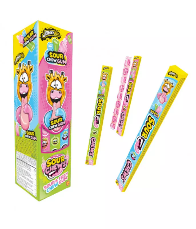 JOHNYE BEE – Pâte de Chewing gum à mâcher 30 cm, fourré à de poudre acide – vendu en gros conditionnement dans un présentoir de 24 pcs ou dans un carton de 12 x 24 pcs