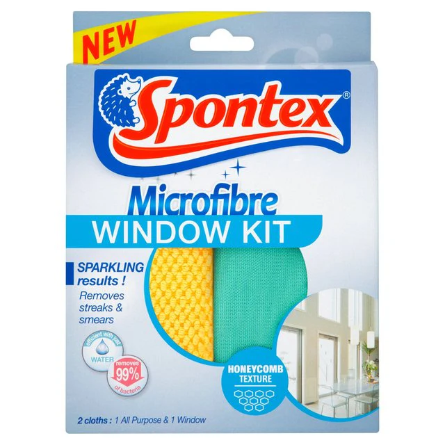 The Spontex Microfibre Window Kit leaves your windows streak free and sparkling. The green Window Cloth with honeycomb texture effectively removes even the smallest particles and smudges, leaving a perfect smear free finish. The yellow All Purpose Cloth with thick 3D weave easily tackles dirt and dust, even on delicate surfaces, leaving a brilliant finish. For best results, use the All Purpose Cloth damp, with any excess water wrung out to wash down and the Window cloth dry to finish. Ideal for all glass, mirrored and shiny surfaces. Composition: Window Cloth: 85% Polyester, 15% Polyamide. All Purpose Cloth: 85% Polyester, 15% Polyamide.