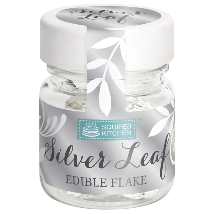 Bring a touch of luxury to all your special cakes, bakes and desserts in an instant with Squires Kitchen Pure Silver Leaf Flake. The pure silver leaf is completely edible and adds a decadent surface decoration to chocolates, cakes, gateaux and desserts. You can even add tiny flakes of silver leaf to champagne for a sophisticated drink that truly sparkles, or make a memorable breakfast by stirring it through homemade marmalade. You can also use it to gild apples, pears or oranges as table centerpieces, or even gild the turkey on Christmas day! Each pot of Silver Leaf Flake contains one leaf measuring 8cm square.