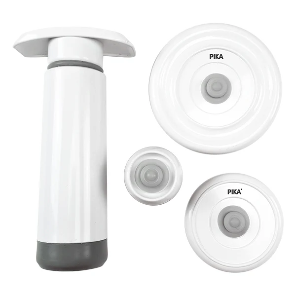Rien ne se perd, tout se conserve grâce au starter kit de mise sous vide ! Très pratique et peu encombrant, ce kit se compose d’une pompe manuelle de mise sous vide, d’un bouchon de vin, d’un couvercle taille S (6 cm) et d’un couvercle taille M (8,2 cm). Ces différents composants vous permettront de conserver tous vos aliments plus longtemps puisqu’il s’adapte à tous les types de récipient. Idéal pour éviter le gaspillage et consommer de manière plus écologique en éliminant le film alimentaire. Indispensables, les couvercles universels Pika permettent de remettre sous-vide n’importe quel récipient ou bouteille.