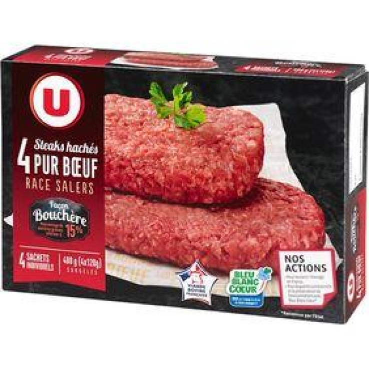 4 steaks hachés pur boeuf surgelés, 15% de matières grasses 100% viande bovine Origine France /
