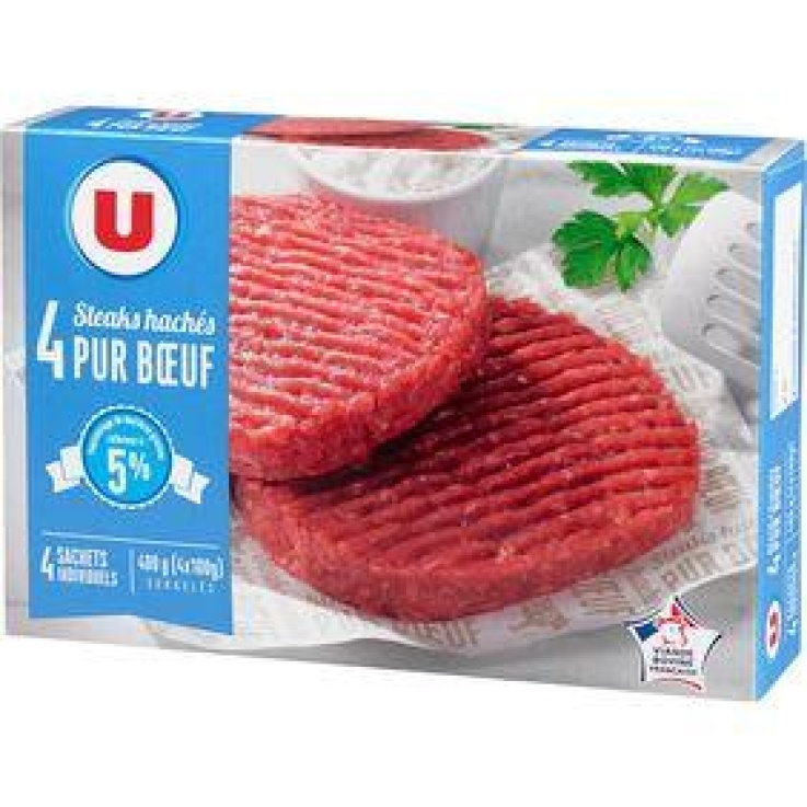 Steaks hachés pur boeuf surgelés, 5% de matière grasse 100 % viande bovine origine France /