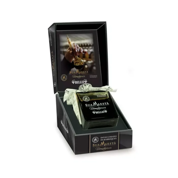The Sua Maestà Denso Dolce Bellei Balsamic Vinegar of Modena PGI Dressing already has a very attractive packaging, but in this elegant gift box it gives its best. It is a condiment aged in barriques that Acetaia Bellei has been producing since its origins. It is born from the union of the best quality cooked grape must, wine vinegar and Balsamic Vinegar. It is a condiment particularly appreciated for its light acidity (4%) and the high density of 1.35 given by the high percentage of cooked must that is used in the recipe unlike the classic balsamic vinegar of Modena PGI, which in fact has a higher acidity. The elegant handkerchief that covers the cap, an iconic symbol of Bellei, represents the map of Modena and is packaged by hand. Ideal to pair with grilled meat, boiled vegetables, Parmesan, vanilla ice cream and fruit.
