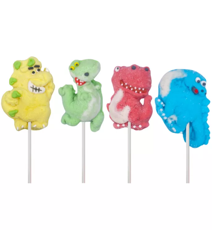 SWEET MANIA – Sucette en guimauve (Marshmallow, Chamallow) en forme de Dinosaure ! – Vendu en gros conditionnement dans un présentoir de 12 sucettes