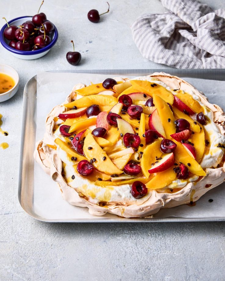 Generously dollop the cream into the dip of the pavlova. Decorate with fruit and serve!