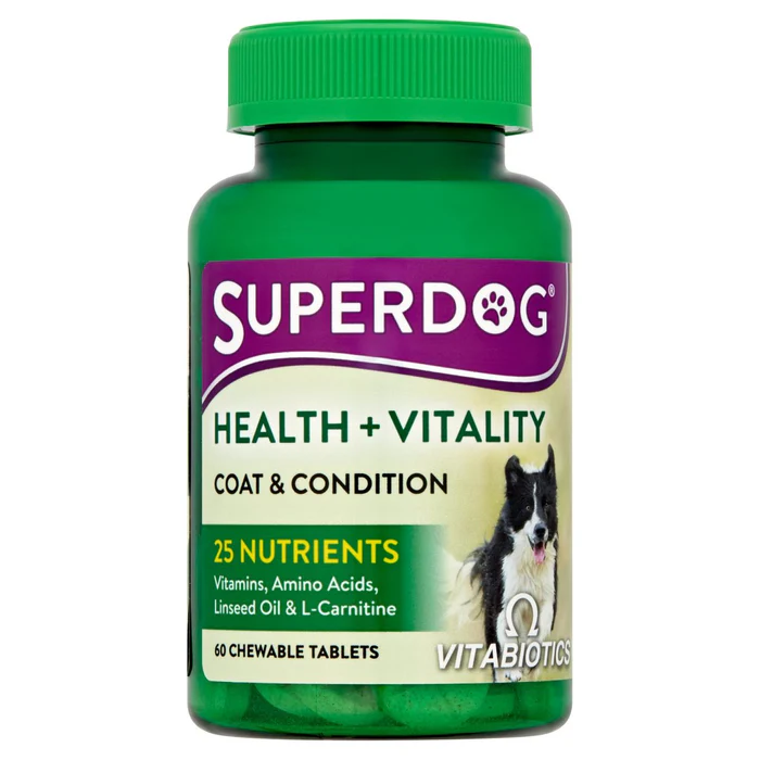 All-in-one supplement packed with 25 essential vitamins & minerals to support the general health, vitality and skin & coat condition of your dog. Chewable tablets in a delicious, braised beef flavor. The key to a healthy, happy dog is often similar to humans; enough love, care and attention, plenty of exercise, a varied, balanced diet and a sufficient intake of essential vitamins and minerals. SuperDog Health & Vitality contains a complex blend of essential nutrients to promote the overall health and wellbeing of your dog, whatever their size or breed. Queen’s Award 4 Times Winner, 25 Nutrients Vitamins, Amino Acids, Linseed Oil & L-Carnitine, Delicious Braised Beef Flavor (vegetarian source), No Artificial Colors or Preservatives, Superdog Has Not Been Tested on Animals, Suitable for dogs given a vegetarian diet.