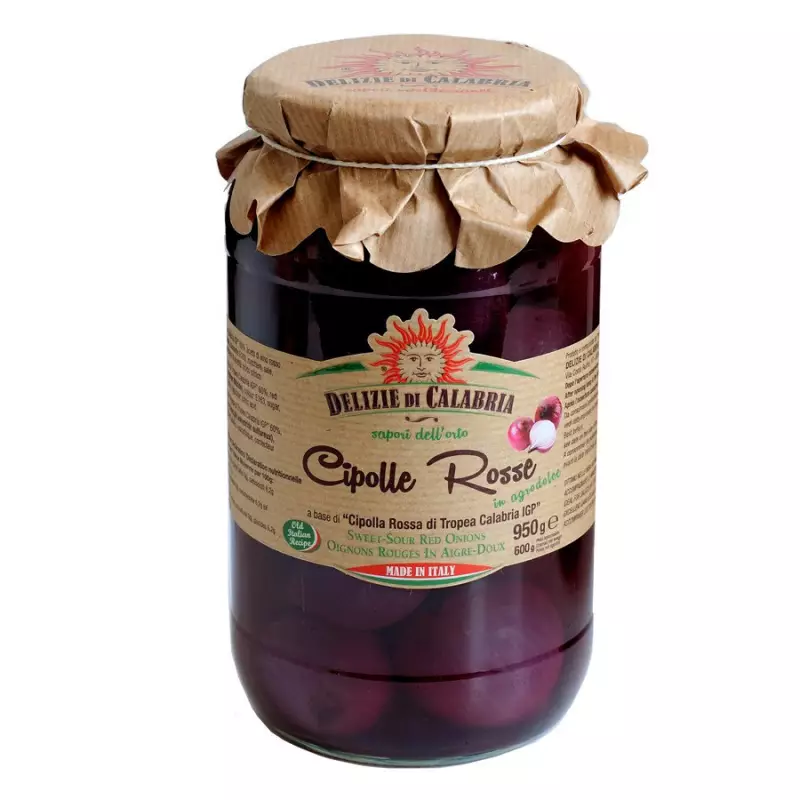 The sweet and sour IGP Calabria Red Onion in 950 g maxi jar by Delizie di Calabria is a unique product that stands out for its inimitable sweetness, irresistible crunchiness and extraordinary versatility in cooking. IGP-certified since 2008, the Cipolla Rossa di Tropea is a symbolic product of Calabria in the world. The sweet and sour version of the red onion enhances all the qualities of this typical Calabrian delicacy. Perfect to enjoy on its own or to enrich your summer salads, this onion brings the authenticity and flavours of Calabrian tradition to the table.