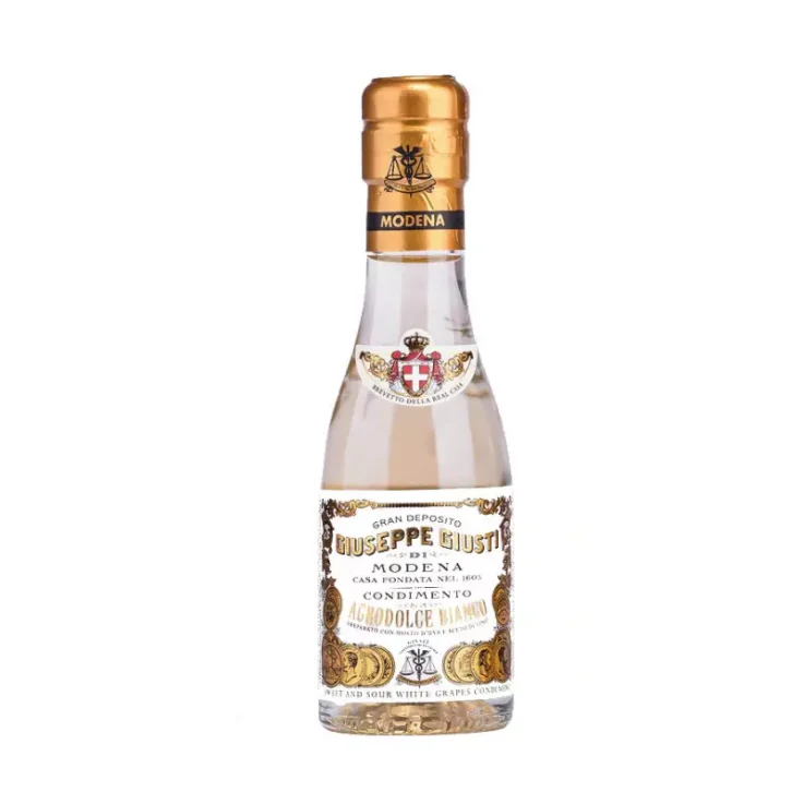 This is then combined with high quality white vinegars and aged in french oak and ash wooden barrels. This process keeps all the fruity and floral aromas of the grapes, creating a very pleasant condiment, thanks to the contrast of its low acidity and the notes of sweet, yellow fruits and dried citrus. Fresh and balanced, it is extremely versatile and easy to use. Try it in this nice 100 ml mignon bottle.