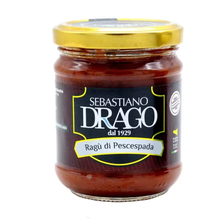 Swordfish Ragout 190 gr by Sebastiano Drago brings the true flavour of Sicilian tradition to the table. Prepared according to ancient recipes, this sauce enhances the delicacy of swordfish, which is cooked, carefully filleted and stripped of skin and bones. Made with simple and genuine ingredients, such as tomato puree, olive oil and a touch of chilli pepper, this sauce releases all the authentic scent and taste of the Sicilian sea. In accordance with tradition, it is without added starches or flavour enhancers, to offer you a natural product of the highest quality. Perfect for enhancing your first courses with a refined and genuine touch.