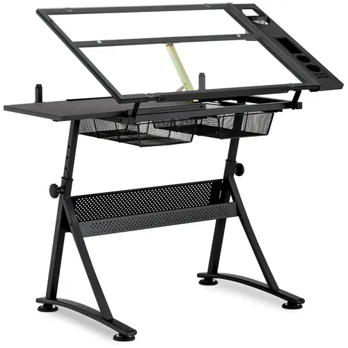 Jouissez de conditions de travail professionnelles grâce à notre table d’architecte inclinable. Dotée d’un plateau de 120 x 60 cm, cette table permet de réaliser des dessins propres et professionnels de grande dimension. Sa planche à dessin très robuste se compose d’un plateau de verre d’une épaisseur de 6 mm à côté duquel se trouve une tablette supplémentaire en fibres de bois, d’une épaisseur de 15 mm, recouverte de PVC. Comme la planche s’incline sur une plage de 0 à 70°, la table peut donc aussi bien faire office de bureau classique que de planche à dessin. Sa hauteur de 90 cm est idéale pour travailler debout.