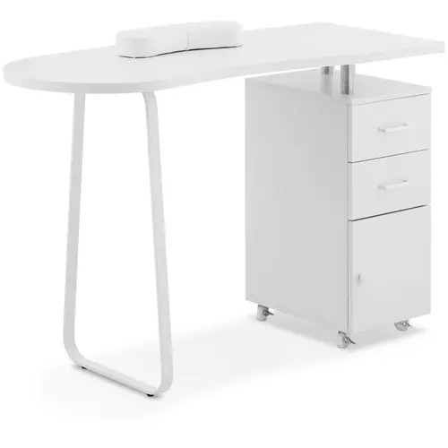 Le grand plateau de cette table vous offre beaucoup d’espace pour travailler confortablement. Avec deux tiroirs, un compartiment et une étagère d’un côté, vous pouvez ranger tous les ustensiles de façon organisée et hygiénique. D’autre part, un support assure sa stabilité. Avec le repose-main inclus dans la livraison, vous obtenez un confort maximal pendant le soin. Qu’il s’agisse de manucure classique, de modelage des ongles ou des activités de bureau : vous pouvez utiliser cette table de salon de manucure de différentes manières.