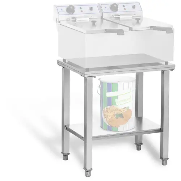 Grâce à son grand plan de travail de 62 x 42 cm, cette table vous offre l’espace suffisant pour poser différents appareils de cuisine. La table a été conçue spécialement pour y poser des double-friteuses, mais peut également être utilisée pour d’autres appareils tels que gaufriers, hachoirs ou même des couverts. De cette manière, il s’agit d’un support en acier inoxydable multifonctionnel indispensable. De plus, en-dessous du plan de travail, vous disposez d’une étagère supplémentaire qui vous permet d’y ranger des ustensiles de cuisine et de les garder sous la main.