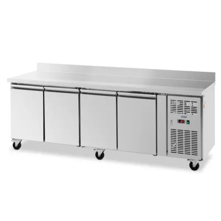 L’un des principaux avantages de ce modèle, c’est son volume impressionnant de 550 l. Sous le plan de travail, vous trouverez quatre compartiments réfrigérés spacieux, que vous pouvez subdiviser chacun avec une grille réglable en hauteur. Le mécanisme d’ouverture et de fermeture en douceur des quatre portes pivotantes facilite la manipulation dans le rythme effréné du quotidien, notamment lorsque vous n’avez pas les mains libres. La porte du système de refroidissement est verrouillable. Le dosseret de la table réfrigérée professionnelle protège les murs et l’environnement des projections d’eau, de la saleté et des dégâts.