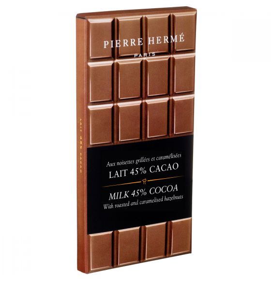 Un chocolat au goût subtil de lait caramélisé et de vanille agrémenté de noisettes grillées du Piémont à la saveur sucrée avec une pointe d’amertume, fine et parfumée. Chocolat au lait 45% de cacao.