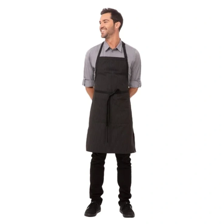 Tablier bavette en polyester-coton finement rayƩ avec tresses contrastƩes noires et poche plaquƩe avec couture centrale.