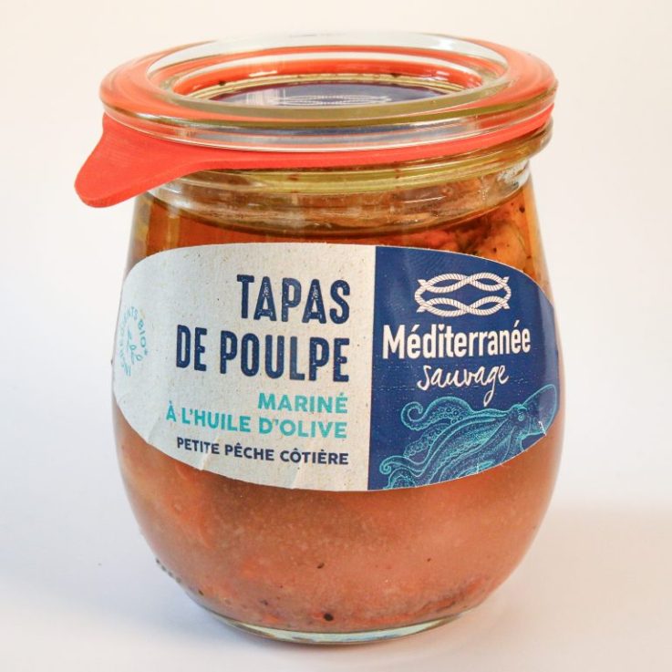 Composition : Poulpe (Eledone spp, Octopus vulgaris) 60%, huile d’olive, huile de tournesol, ail, persil, coriandre, épices.