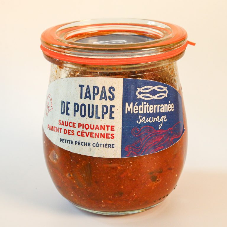 Composition : Poulpe (Eledone spp, Octopus vulgaris) 54%, tomate, échalote, whisky, chocolat noir, épices, huile d’olive, piment des Cévennes 0.5%.