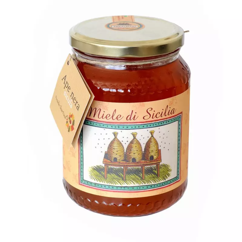 Amodeo Carlo’s Eucalyptus Honey in 1 kg jars is produced in the Palermo, Enna and Nisseno areas in July and August. It has the intense aroma of eucalyptus flowers, strong, characteristic and pungent, and its flavour is equally strong but pleasant, reminiscent of English liquorice sweets. Its colour varies between medium amber and grey when crystallised. Thanks to its intense flavour, it lends itself well with low-fat or very mature cheeses such as Parmesan. Like the entire range of honeys from the Carlo Amodeo company, in order for Eucalyptus Honey to maintain all its properties for longer, it is extracted from the honeycombs taken from the flowering areas every 7 days to avoid oxidation at high temperatures, immediately centrifuged, decanted, potted and placed in cold storage at 4 degrees. Apicoltura Carlo Amodeo boasts a production of the finest and most typical Sicilian honeys from the native Sicilian bee, the Black Bee (Apis mellifera siciliana), which has become a Slow Food Presidium. Defined as black because of its dark colour, the Sicilian bee is distinguished by some important peculiarities such as productivity and earliness. Moreover, the Sicilian bee has a very low honey consumption and a strong capacity to develop from small nuclei.