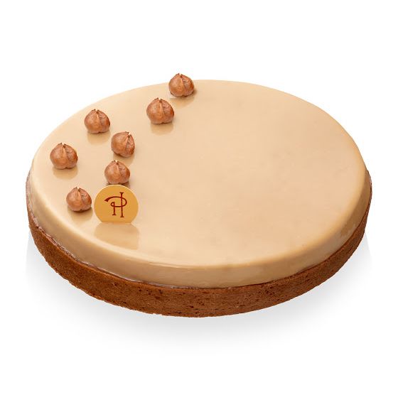 Pâte sablée, biscuit noisettes, praliné noisette fondant et croustillant, crème onctueuse et crème Chantilly aux noisettes, éclats de noisettes du Piémont torréfiées.