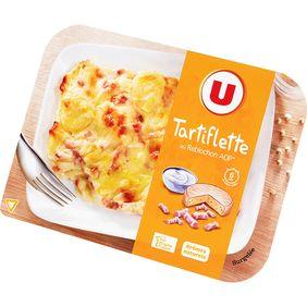 Pomme de terre cuite 50% [pomme de terre 49% (France), sel], eau, lardon cuit fumé 10% [poitrine de porc (France), eau, sel, sirop de glucose, arômes naturels, extraits d’épices, antioxydant : extrait de romarin, ferments, fumage au bois de hêtre], REBLOCHON AOP* 9%, CREME fraîche (France) 6%, oignon 5%, farine de BLE, vin blanc, huile de tournesol, sel, purée d’ail, poivre. *AOP : Appellation d’origine protégée. /