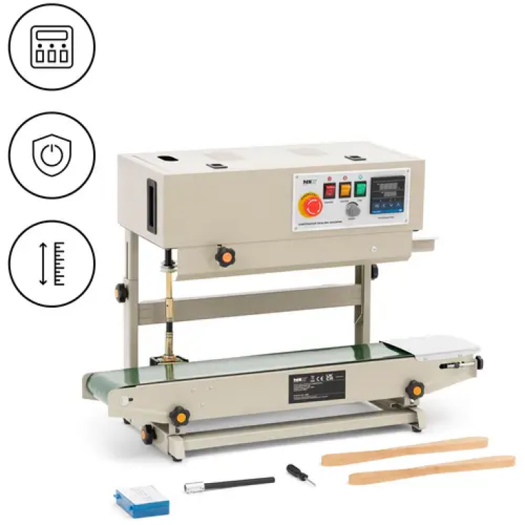 La machine est équipée d’une bande transporteuse robuste et durable. Elle fonctionne presque sans friction et déplace des marchandises pesant jusqu’à 3 kg à travers l’appareil. Elle procède alors à une soudure solide de 6-12 mm de large. Cette machine est facile à utiliser grâce à 2 boutons rotatifs et 3 autres boutons : marche/arrêt, ventilateur, scellage. Les boutons rotatifs vous permettent de régler la vitesse de scellage souhaitée entre 0-12 m/min ainsi que la température entre 0-300 °C. Vous pouvez vérifier tous les réglages sur le devant de l’appareil. Ainsi, vous adaptez l’appareil en fonction de vos besoins. Des vis de serrage faciles à saisir permettent de modifier la hauteur de la bande transporteuse et de l’appareil de scellage. Et vous pouvez également adapter la pression de soudure à l’épaisseur du sachet à sceller.