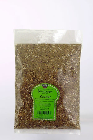 • Ingrédients : Thym 25%, SÉSAME 25%, sumac 25%, BLÉ vert 15%, sel 5%, acide citrique E330. Conditionné dans un atelier qui utilise: CÉLERI, SÉSAME, FRUITS à COQUES, GRAINES DE MOUTARDES, GLUTEN, SULFITES, OEUFS, SOJA, LAIT.