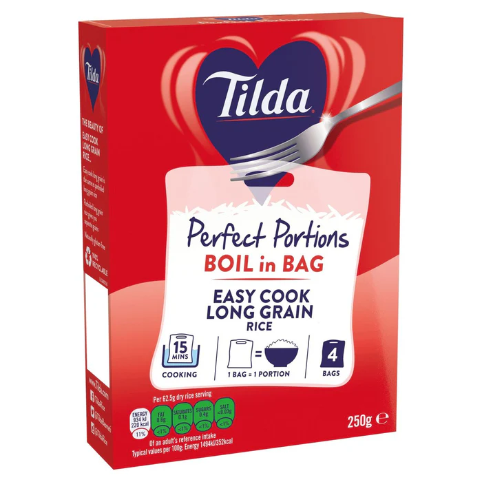 Our individual sachets of easy cook long grain rice give you a great base or a tempting side for a whole host of dishes. Easy cook long grain is the same as parboiled long grain rice. With half a century of expertise, we hand-select premium grains to make sure only the best rice is used in every Tilda pack. From our specialty farmers, our Long Grain rice is known for its clean fresh taste that you’ll adore from the very first taste. The perfect versatile rice that works across world cuisines. Perfect Portions to accompany for a wide range of delicious curries. 15 minutes cooking, 1 bag = 1 portion, naturally gluten-free.